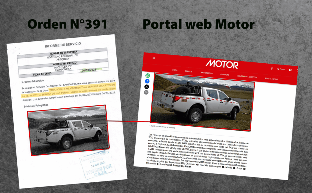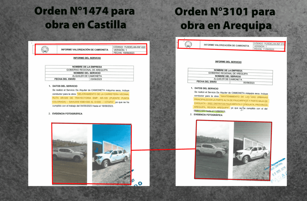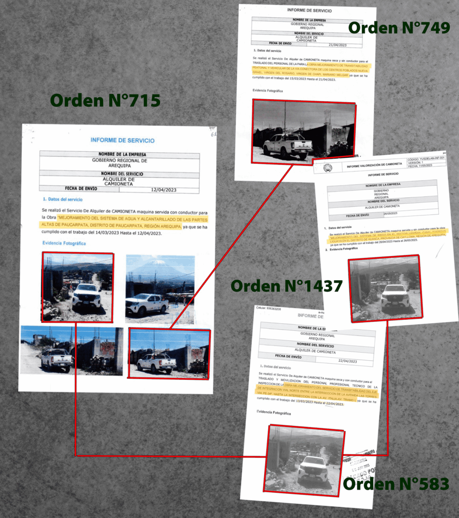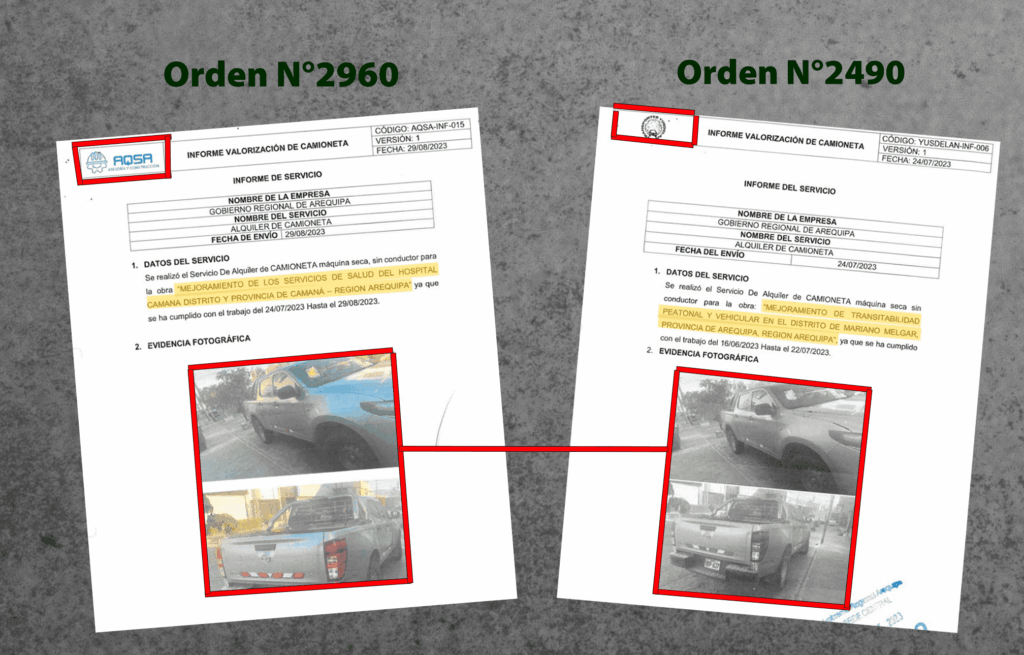 Entre las fotos más copiadas están las que presentó AQSA por el alquiler de camioneta para el mejoramiento de alcantarillado de las partes altas de Paucarpata con la Orden de Servicio N°715. Cobraron por ello S/ 22 800 por 90 días. Presenta cuatro tomas de diferentes ángulos de la unidad “ERI-765” en su “Informe de servicio”. Sin embargo, una de las instantáneas la repitió en el informe de un contrato distinto: en el mejoramiento vial de centros poblados de Mariano Melgar con la Orden de Servicio N°749. Por esta, el GRA pagó S/ 18 000 por 60 días.