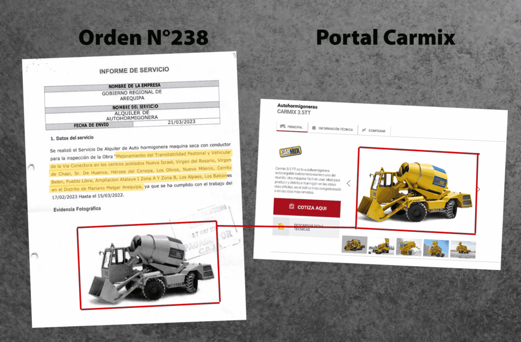 En el alquiler de una autohormiguera para el mejoramiento peatonal y vehicular de centros poblados de Mariano Melgar, AQSA sustrajo la foto de alguna página que vende la máquina de la marca CARMIX. La antigüedad de la instantánea, y por la que justificó el pago de S/ 38 465 por la O.S. N°238, es de, por lo menos, seis años. Hay que puntualizar que AQSA alquiló la unidad a GREMA SRL en 2022, según los documentos presentados en expediente.