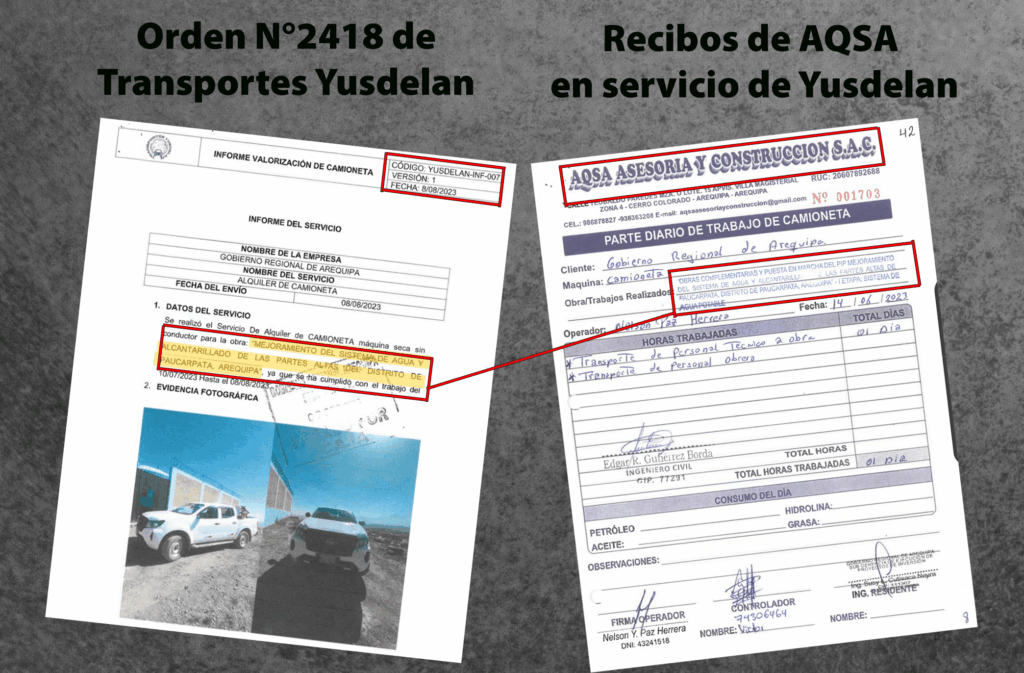 Tres días antes de que AQSA culminara su servicio, Transportes Yusdelan obtuvo la O.S. N°2418 de S/ 31 240 por arrendar 142 días su máquina para la misma obra. Lo sorprendente es que sus recibos del reporte diario para acreditar la prestación, son de AQSA, la otra empresa. Además, Transportes Yusdelan señala que utilizó su unidad VCF874, la misma que utilizó AQSA en el anterior servicio.