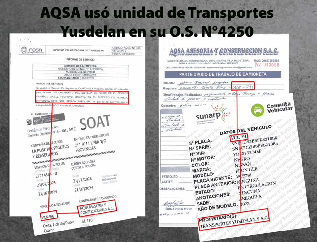 Hay otro fraccionamiento en la obra del canal Tocroyo-Liguaya en Caylloma. Los servidores del GRA pudieron convocar a una licitación por más de S/ 68 000, pero optaron por contratar a dedo. Este caso empezó con AQSA y Transportes Yusdelan simulando competir presentando sus cotizaciones. Al final, Logística entregó la buena pro a la segunda empresa. Transportes Yusdelan en sus reportes diarios colocó que solo utilizó la unidad VCE-791. Sin embargo, el SOAT y póliza presentados son de la camioneta VCF-874. Mientras que la fotografía de evidencia es del vehículo “*RI-765”. Ningún funcionario, ni área observó estas incongruencias.