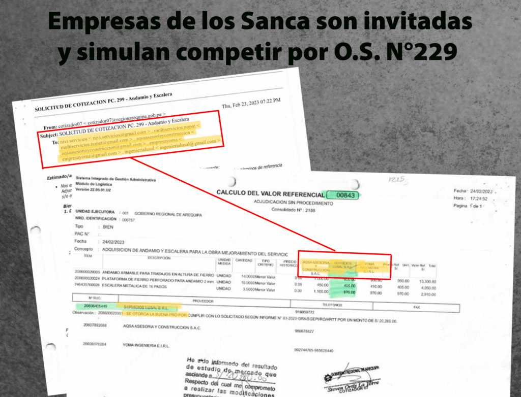 Logística calcó el esquema para la compra de 14 andamios, 3 escaleras y 10 plataformas de fierro por S/ 20 260 de la O.S. N°229 en la misma obra. En el correo para invitar a cotizar se coloca a Servicios Lusal, Nopat, AQSA y Yoma. Yoma y AQSA son quienes simulan pelear la contratación enviando cotizaciones mayores. Por ello, al final escogen a Servicios Lusal como la vencedora.