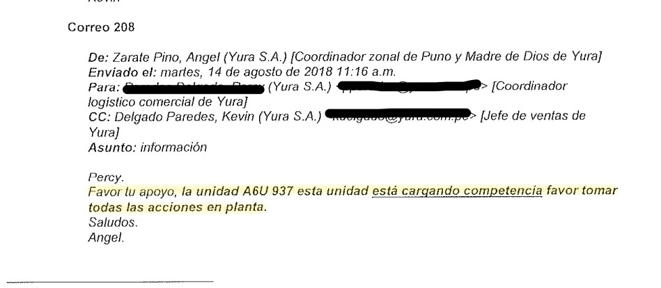 “La unidad A6U-*** está cargando competencia, favor tomen todas las acciones en planta”, escribió Angela Zarate Pinto, coordinadora de Puno y Madre de Dios, al coordinador logístico comercial, del 14 de agosto del 2018. “Evaluar la forma en que estos transportistas tengan el acceso restringido en nuestras plantas”, recomendó Alex Rivera Álvarez, coordinador logístico comercial de Yura, el jueves 22 de enero del 2015. Así Yura impidió que existan alternativas para los clientes y consumidores utilizando diversos medios para que se distribuyera cemento de la competencia.