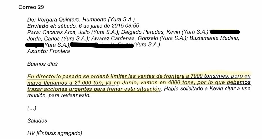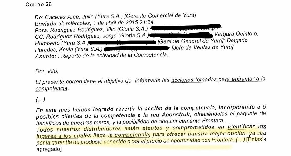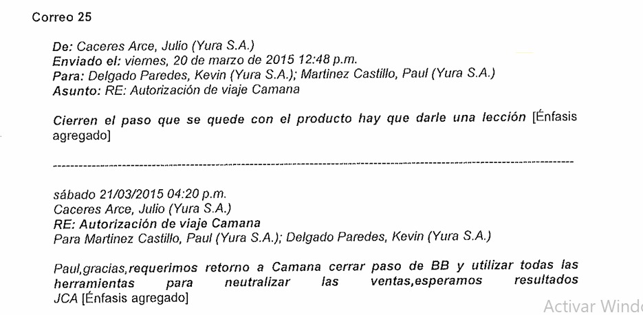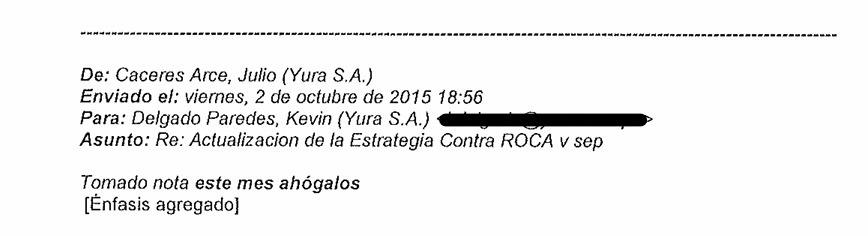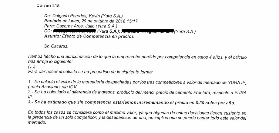 “Este mes ahógalos”, pidió Cáceres contra otras cementeras mediante correo electrónico del 2 de octubre del 2015 dirigido a Kevin Delgado Paredes. El gerente de gestión comercial de Yura, manifestó su molestia porque sus trabajadores permitieron la venta de 1200 toneladas de cemento Mishky de Rocatech en la región Cusco. En la actualidad es director comercial de la división de cemento, concreto y cal del Grupo Gloria.