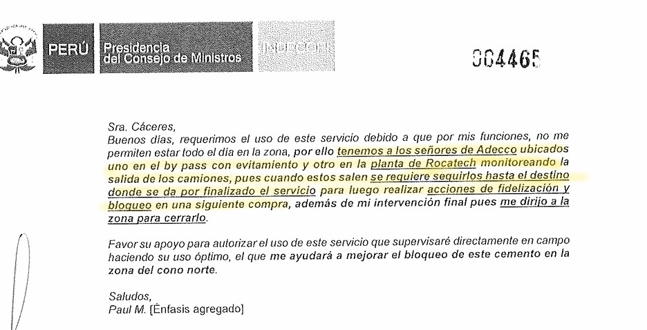 Estas prácticas sucias se fueron agravando cada vez más. Incluso Yura era capaz de instalar un contenedor que funcionara como oficina en las inmediaciones de la planta de uno de sus adversarios, solo para continuar con el espionaje, como señala una comunicación interna de la cementera. En la “Presentación Rocatech”, correo difundido el 24 de enero del 2015, se advierte que la estrategia es identificar placas de los vehículos que transportaban cemento de la competencia, el nombre del comprador, la cantidad de bolsas y el destino de dicho producto, con el objetivo de “cerrarles el paso”.