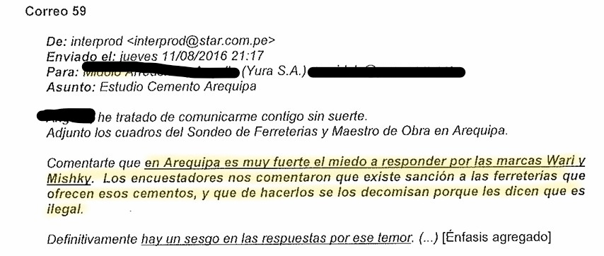 El conjunto de correos no se hubiese conocido sin la denuncia de Direpsur. Contrastar las estrategias sucias ejecutadas por Yura y Raciemsa hubieran sido complicadas. Direpsur denunció al gigante en noviembre del 2018 por bloqueos y dificultades en la venta de su material de construcción ante el Instituto Nacional de Defensa de la Competencia y de la Protección de la Propiedad Intelectual (Indecopi).