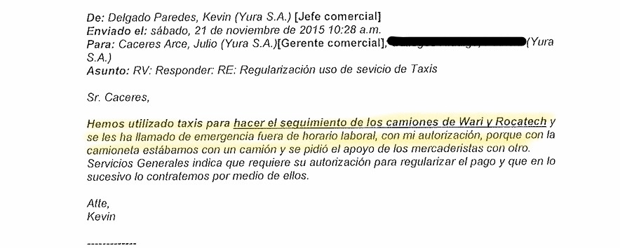 Según Alexander, Kevin Delgado, jefe de Marketing de Yura en ese entonces y jefe Comercial después, le daba la orden directa de vigilar las unidades. Debía averiguar qué dirección tomaban, si para Arequipa o Mollendo. “El señor Kevin Delgado (me pidió) que monitoree, que envíe fotos, que saque fotos de las placas, de las unidades, que color era el tracto, qué color era la tolva. Todo eso se enviaba…”, manifestó en una entrevista concedida a Indecopi para la investigación.