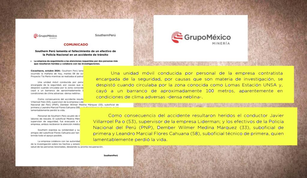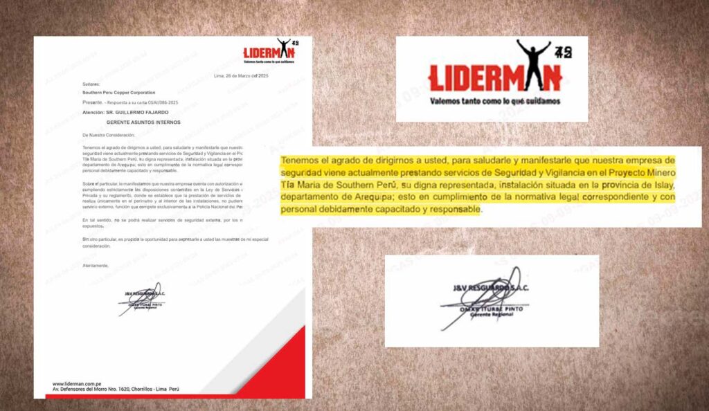 La empresa contratista que da seguridad al proyecto minero Tía María, es J & V Resguardo SAC, que tiene como nombre comercial Liderman. Southern confirmó esto en el mismo comunicado en que dio a conocer la muerte del suboficial Flores Cahuana. Javier Villarroel Palo, supervisor de la empresa Liderman, fue uno de los heridos en el accidente. Él mismo conducía la camioneta que cayó al barranco. No solo el proyecto Tía María tiene resguardo policial sino también privado, pese a que el TC ordenó a la PNP suscribir convenios siempre y cuando la empresa demuestre desamparo en cuanto a seguridad.